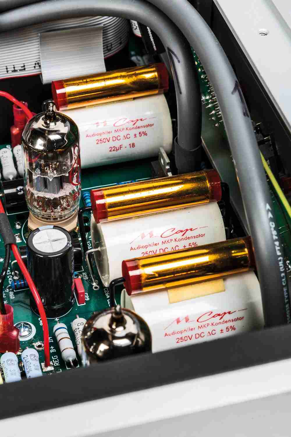- Активный усилительный каскад с низким уровнем шума и гибридной конструкцией (JFET в сочетании с лампой 12AU7) для лучшего разрешения сигналов низкого уровня