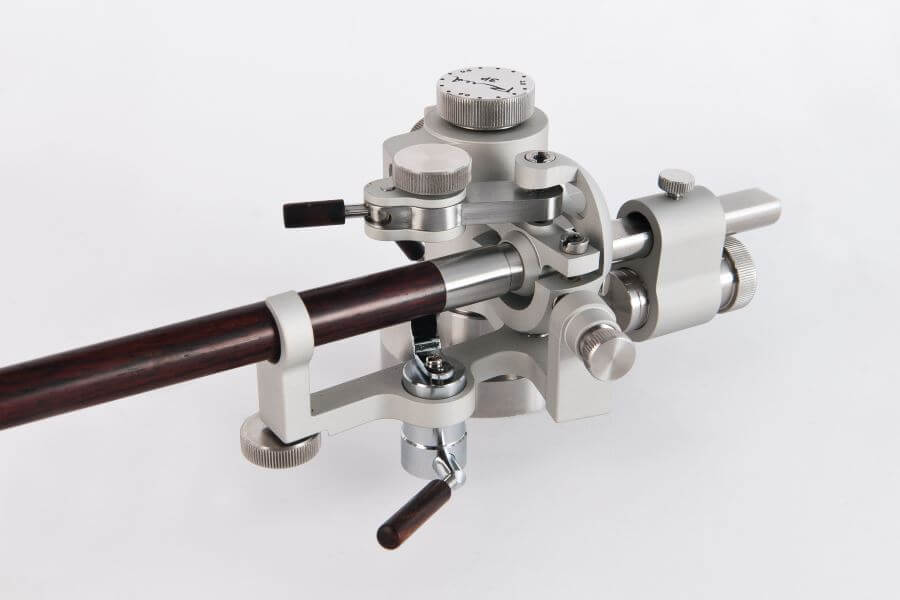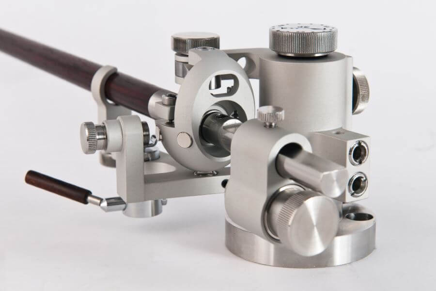 Еще одна существенная деталь этого тонарма — поворотный узел. С конструктивной точки зрения эту систему подшипников нужно отнести к карданной, но по результирующей работы поворотного узла тонарм скорее стоит сравнивать с одноопорными моделями. Система подшипников обеспечивает смещения положения тонарма в разных плоскостях и сохраняет жесткость конструкции, а за счет магнитных стабилизаторов стало возможным уменьшить воздействие трения до уровня, сопоставимого с тем, который имеют одноопорные тонармы.