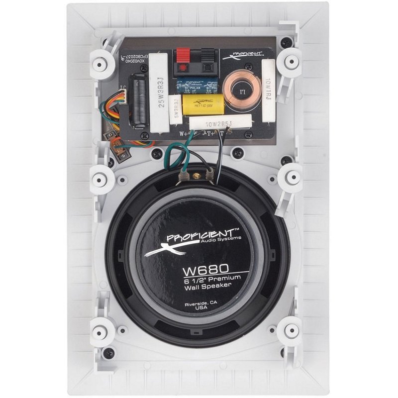 Встраиваемые в стену акустические системы Proficent W680 - с низкочастотными динамиками с графитовым дифузором диаметром 165 мм, скобами НЧ динамика из литого магния, поворотными алюминиевыми купольными твиттерами диаметром 26 мм, контурными переключателями низких и высоких частот ±3 и мощностью 125 ватт. Частотный диапазон: 32 Гц – 22 кГц. Сопротивление: 8Ω. Чувствительность: 92 дБ 1 Вт/1 м.