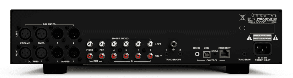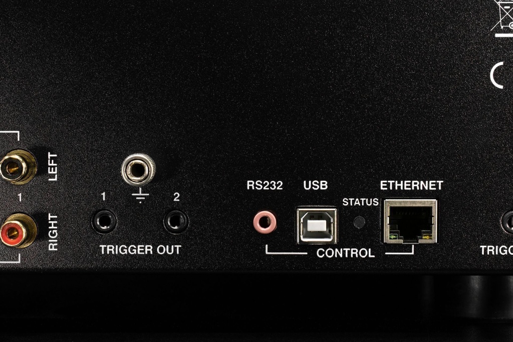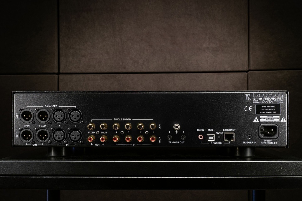 У BP-19 задняя панель действительно напоминает что-то очень студийное и серьезное: две пары балансных входов, две пары балансных выходов — регулируемый и нет. Дальше еще две пары выходов RCA — фиксированный и управляемый. Ну и входов RCA еще четыре штуки, и даже сложно представить ситуацию в домашних условиях, когда эти входы с выходами могли бы закончилиться. Рядом собраны сервисные разъемы: всякого рода триггеры, Ethernet и даже USB «домиком», который точно пригодится инсталляторам, а, может, и вам.